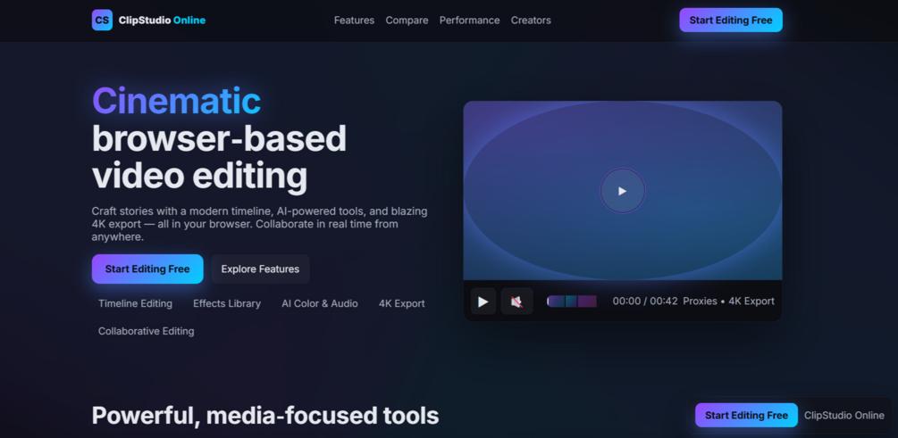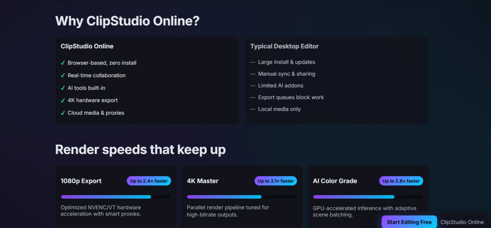 Cinematic Dark. Neon Accents. Instant Credibility. Meet ClipStudio Online — a bold, media‑first HTML landing page built to make browser‑based video editors look premium, powerful, and fast.